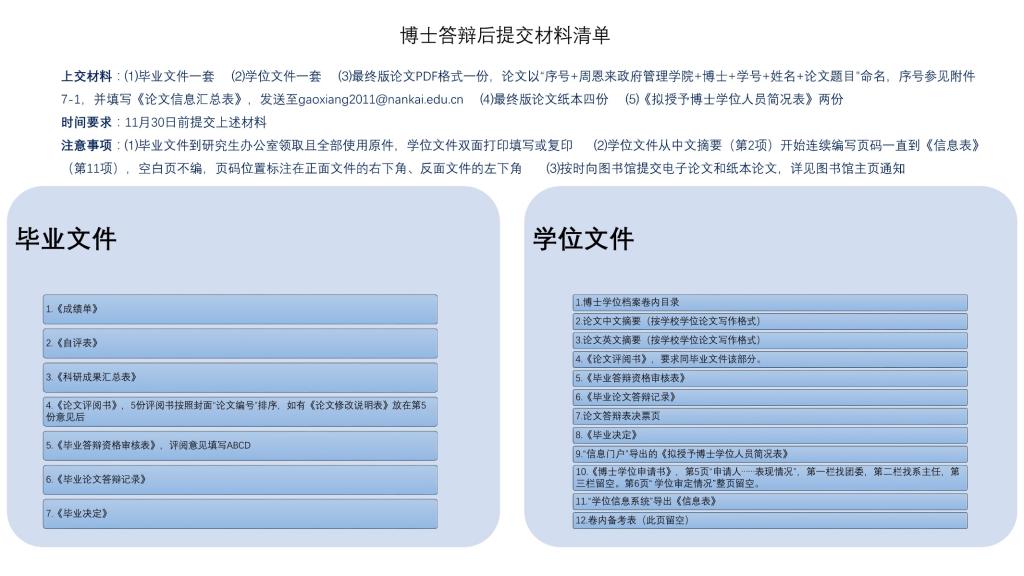 学硕及博士生答辩结束后需要及时准备各种毕业及申请学位的材料,需要提交的材料清单如下: