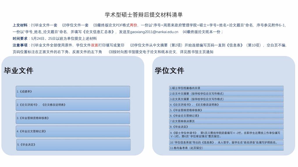 学术型硕士答辩结束后需要及时准备各种毕业及申请学位的材料,需要提交的材料清单如下: