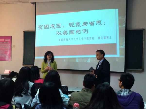 社会工作与社会政策系的邀请来南开访学。黄教授于5月8日下午做了题为“反贫困政策的有效性”的讲座,韩教授于5月9日上午做了题为“贫困成因、现象与省思:以美国为例”的讲座。关信平教授、吴帆副教授和相关老师出席了讲座,并向黄教授和韩教授赠送了纪念品。两次讲座都受到社会工作与社会政策系本科生和研究生的热烈欢迎,产生了良好的反响。