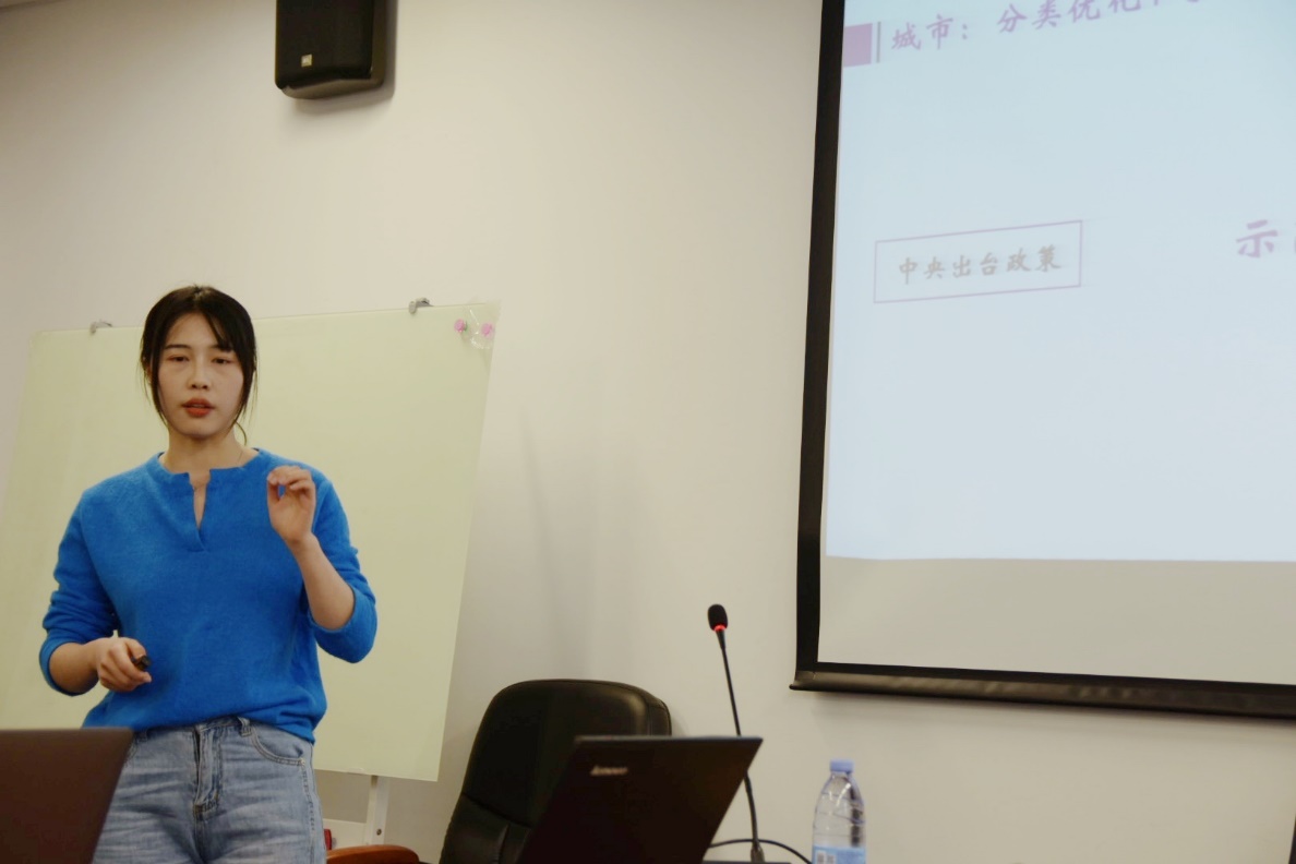 谢伊云同学汇报其论文《基于城市治理的示范城市研究》。近年来各地开展了各类示范城市创建活动,该同学从城市治理的角度,以示范城市政策作为研究主体,对这一政策活动的发起背景与现状、可行性依据、城市行动路径以及国家与城市的自主性关系进行了理论上的探讨。该文旨在挖掘既有研究的理论张力,为未来的机制性研究奠定基础。与会同学就该文进行交流,有些同学提出文章的研究问题模糊,需要一个核心问题划定文章主线;有些同学认为该文章的支撑论据薄弱,使文章不足以对接实际;部分同学则就行文中的逻辑漏洞、论述不足提出了相关建议。