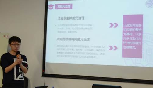 吴涵博同学首先汇报了其论文《机构与资源的双层整合:元治理视角下应急管理体系改革研究》,该论文在归纳了当前应急管理体系在机构和资源层面存在“双层协作断裂问题”的基础上,通过选取元治理理论,进行理论适用性分析,构建了指导中国应急管理体系改革的双层元治理模式。与会同学提出了政府内部的元治理是否存在,分属不同部门的应急职能如何具体整合等问题。