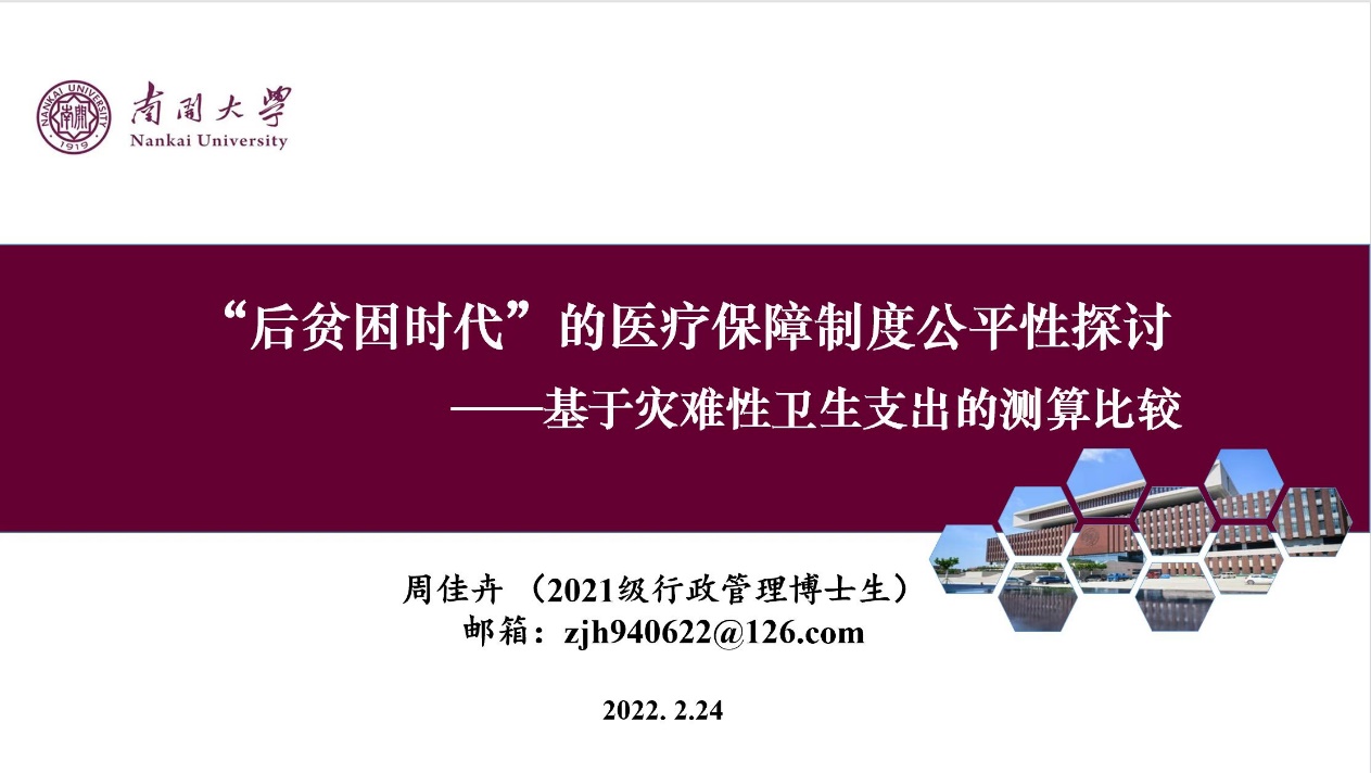 周佳卉同学汇报了《“后贫困时代”的医疗保障制度公平性探讨——基于灾难性卫生支出的测算比较》一文。该文着眼于2020年之后“后贫困时代”的相对贫困问题,通过测算比较城乡间、不同收入群体间、不同地区间灾难性卫生支出,分析了医疗保障制度中的分配不公平现状,进而有针对性地提出了如何促进医保制度更加公平的政策建议。与会师生也结合当下热点与汇报人进行了探讨。