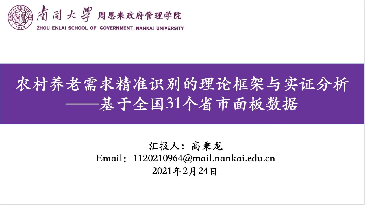 高秉龙同学汇报了《农村养老需求精准识别的理论框架与实证分析——基于全国31个省市面板数据》一文。他从当前农村养老需求无法满足的现实关怀出发,回顾了政府识别农村养老需求的阶段演进,从消费实现视角提出了精准识别农村养老需求的理论框架,并进行了相应的实证检验。与会师生就汇报内容进行了评述和讨论,针对文章的指标选取、研究目标的落脚点、农村养老的复杂性、相关的新政策向汇报人提出了问题。