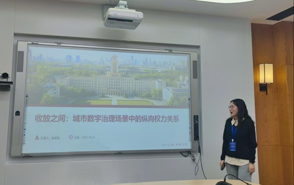 博士生赵紫涵在青年论坛上以《收放之间:城市数字治理场景中的纵向权力关系》为题进行汇报。她指出,数字平台的应用场景是部门工作的可视化呈现,反映了其对资源掌控与调配的能力。在对不同应用场景进行类型学划分后可以发现,纵向权力关系在平台运作中得以重构。政府数字化转型实质上是不同层级政府在“趋利控权”与“适度让权”的动态博弈。在平台推动下,权力不再依附于静态的制度授权,而是在技术嵌入中通过协商、试探与调整实现再分配。