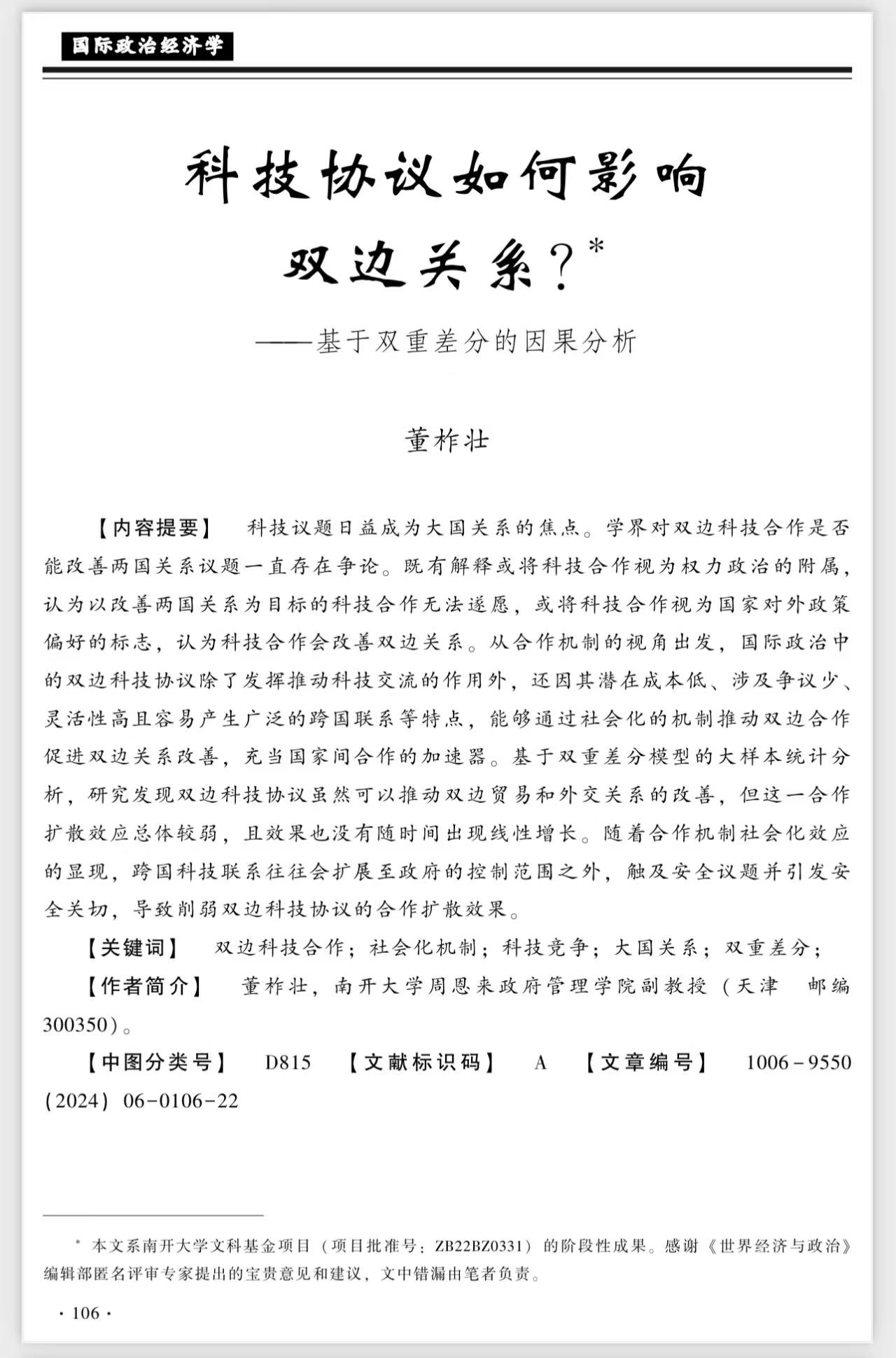 伊利论坛 伊利论坛 董柞壮副教授在2024年第6期的《世界经济与政治》发表文章《科技协议如何影响双边关系——基于双重差分的因果分析》。文章从科技合作这一焦点议题出发,基于合作机制视角,利用双重差分模型的大样本统计,分析科技协议对双边关系的影响。文章指出双边科技协议对双边关系的改善短期内有一定效果,但随着合作机制社会化效应的显现,跨国科技联系往往会引发安全关切,进而削弱双边科技协议的合作扩散效果。