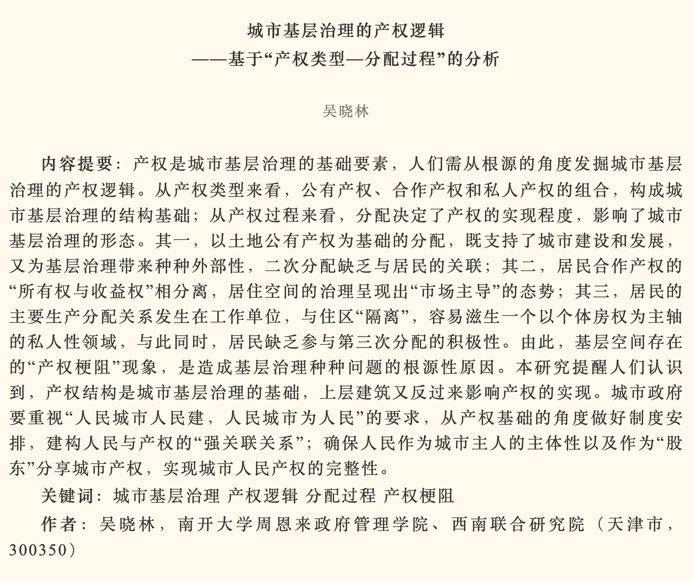 吴晓林教授在2024年第3期的《政治学研究》发表文章《城市基层治理的产权逻辑——基于“产权类型—分配过程”的分析》。文章从产权类型和产权过程分析了城市基层治理的产权逻辑,指出基层空间存在的“产权梗阻”现象是造成基层治理种种问题的根源性原因。文章启示产权结构是城市基层治理的基础,上层建筑又反过来影响产权的实现。城市政府要重视“人民城市人民建,人民城市为人民”的要求,从产权基础的角度做好制度安排,建构人民与产权的“强关联关系”;确保人民作为城市主人的主体性以及作为“股东”分享城市产权,实现城市人民产权的完整性。
