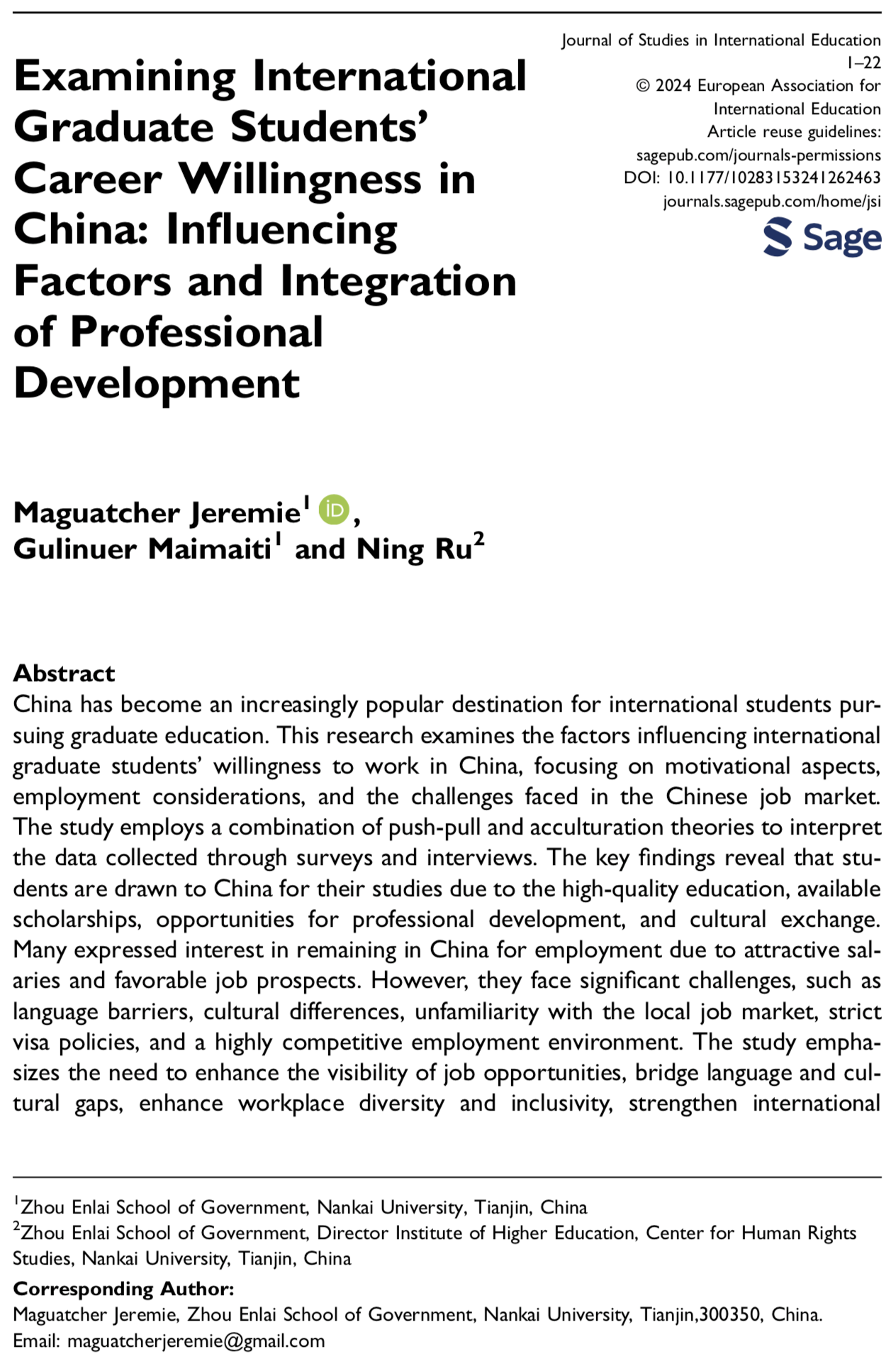 师生在国际教育管理领域取得重要学术成果,学院博士留学生Maguatcher Jeremie、博士生古丽努尔·买买提与茹宁教授合作撰写的论文成功发表在国际核心英文期刊Journal of Studies in International Education上。