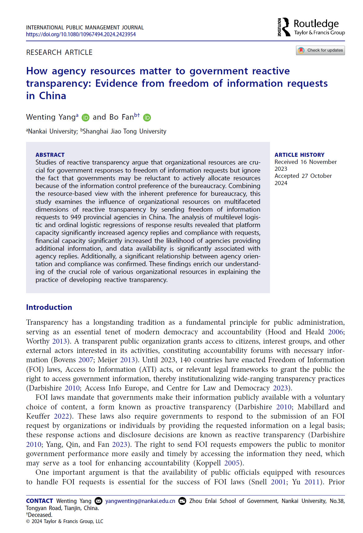 Wenting Yang & Bo Fan. (2024). How Agency Resources Matter to Government Reactive Transparency: Evidence from Freedom of Information Requests in China. International Public Management Journal, 1–19. //doi.org/10.1080/10967494.2024.2423954
