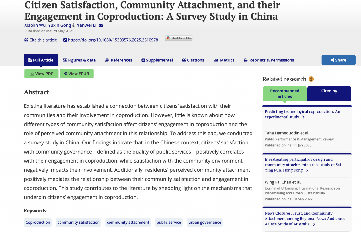 李延伟教授合作的学术论文Citizen Satisfaction, Community Attachment, and Citizens’ Engagement in Coproduction: A Survey Study in China被公共管理著名期刊Public Performance & Management Review(PPMR)接受并在线发表。PPMR是美国公共行政学会(ASPA)公共绩效与管理分会(SPPM)的旗舰期刊,也是公共管理学科的标志性期刊之一。