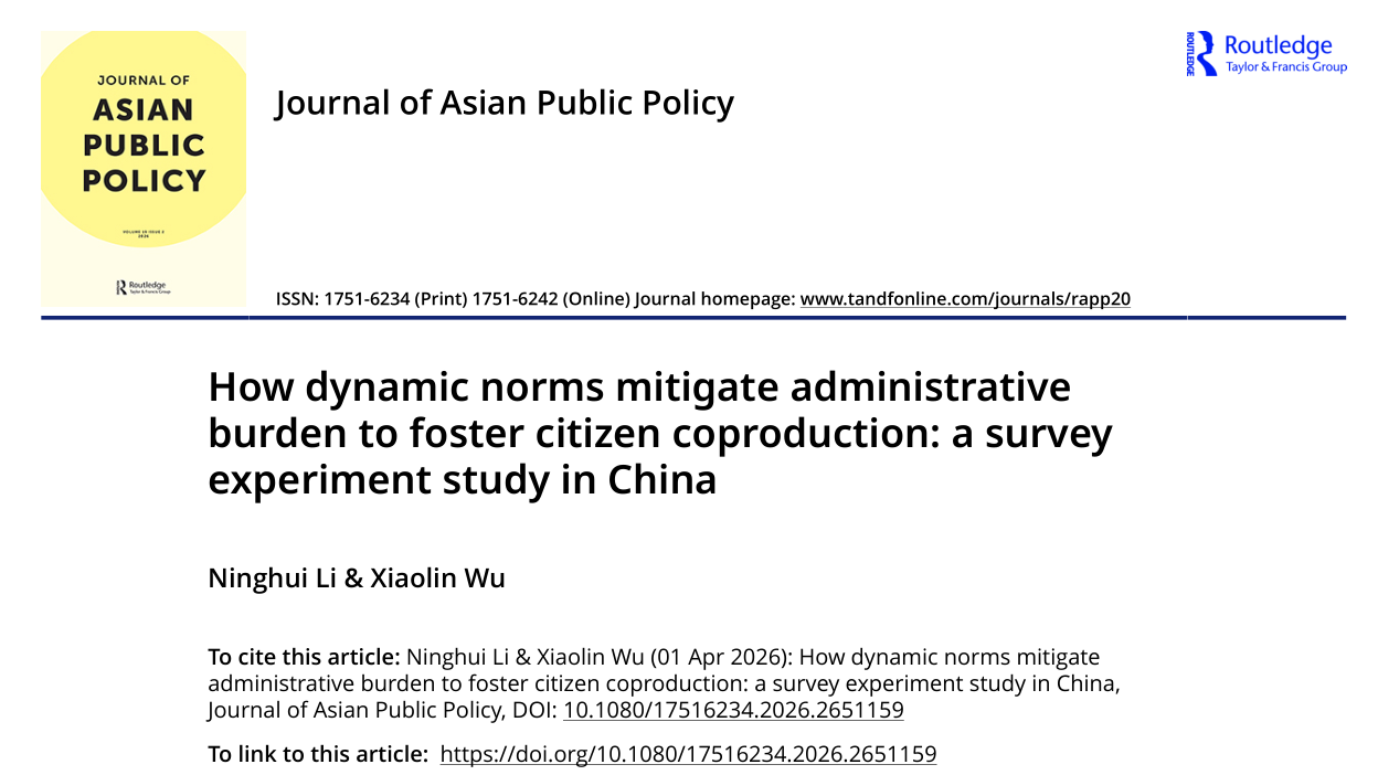 近日,伊利论坛 伊利论坛 吴晓林教授(通讯作者)和博士研究生李宁卉(第一作者)合作的学术论文“How Dynamic Norms Mitigate Administrative Burden to Foster Citizen Coproduction: A Survey Experiment Study in China”被Journal of Asian Public Policy期刊接收并在线发表。Journal of Asian Public Policy (JAPP) 是SSCI区域研究Q1期刊,在Scopus公共行政以及社会学与政治学两大类别中均位列Q1。
