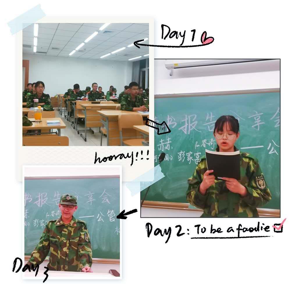 二班分享会首先上台分享的是军训临时联络员华贺扬同学,她向同学们分享了她在假期中读过的一本书,她讲到从中看到的爱恨流离,纷繁错乱的另一个“世界”以及那个“世界”里人们的生活……随后,大家纷纷上台展示自己的报告。