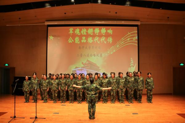 政府学院八连的五个排都精心准备了合唱曲目,并搭配了各具特色的表演形式 。一排演唱《中国军魂》, 沿着九十年军史,八一军魂一路相伴,中国军人始终是人民坚强的守护者,国土忠诚的保卫者。二排演唱了《人民解放军军歌》,“向前,向前!”,中国军人担当着民族的未来和国家的希望 。三排演唱《当那一天来临》,敲响了和平时代的警钟,激励我们向富国强军梦进发。四排和五排都演唱了《精忠报国》,但是各具匠心,各有风采,展现了莘莘学子的拳拳报国之情。