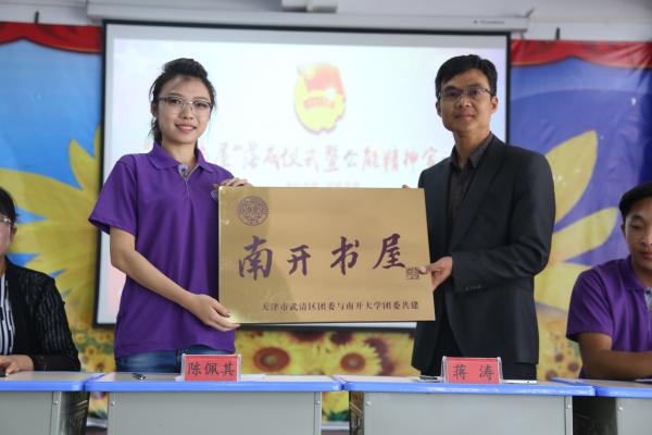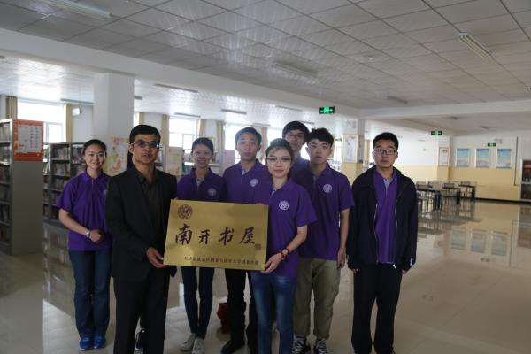 薛博文同学为民族中学的同学们讲解了“南开书屋”的基本情况和社会实践的基本内容之后,陈佩其老师给民族中学蒋涛校长授予了“南开书屋”铜牌,标志着“南开书屋”在祁连县民族中学正式挂牌成立。