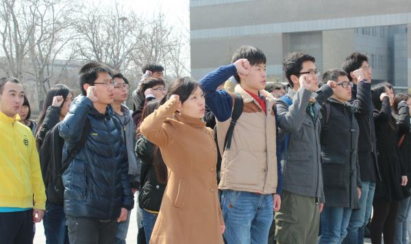 为了表达对总理的崇敬和哀思,广大师生面对总理像三鞠躬,依次献上鲜花,并庄严地举起右手立下誓言:为中华之崛起而读书,为实现自己的理想不懈努力,为实现伟大的中国梦不懈奋斗!