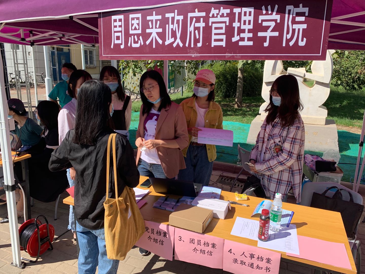 报到现场,新生们手持“公能南开 政因由你”的标语,用镜头记录下这难忘的瞬间,脸上的笑容展现了对未来学习生活的无限憧憬。学院为新生们准备了印有周恩来总理形象的院衫,在学生们成为南开人的第一天就将总理精神铭刻于心。印有“政府学院欢迎你”的口罩贴纸引来新生与家长们的阵阵好评,在疫情常态化阶段,政府学院以这种独特的方式表达了对新生的欢迎与关怀,并提醒新生严格遵守防疫规定,共同守护平安南开园。