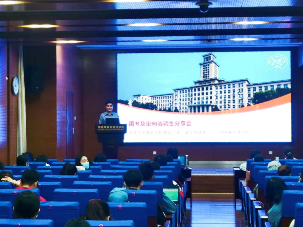 团委创新创业部主办的明公政道系列讲座之国考定向选调生分享会在院楼128报告厅成功举办。活动请到公职类考试资深人气主讲王建群老师与同学们分享相关知识技巧,吸引了众多同学前来参加。