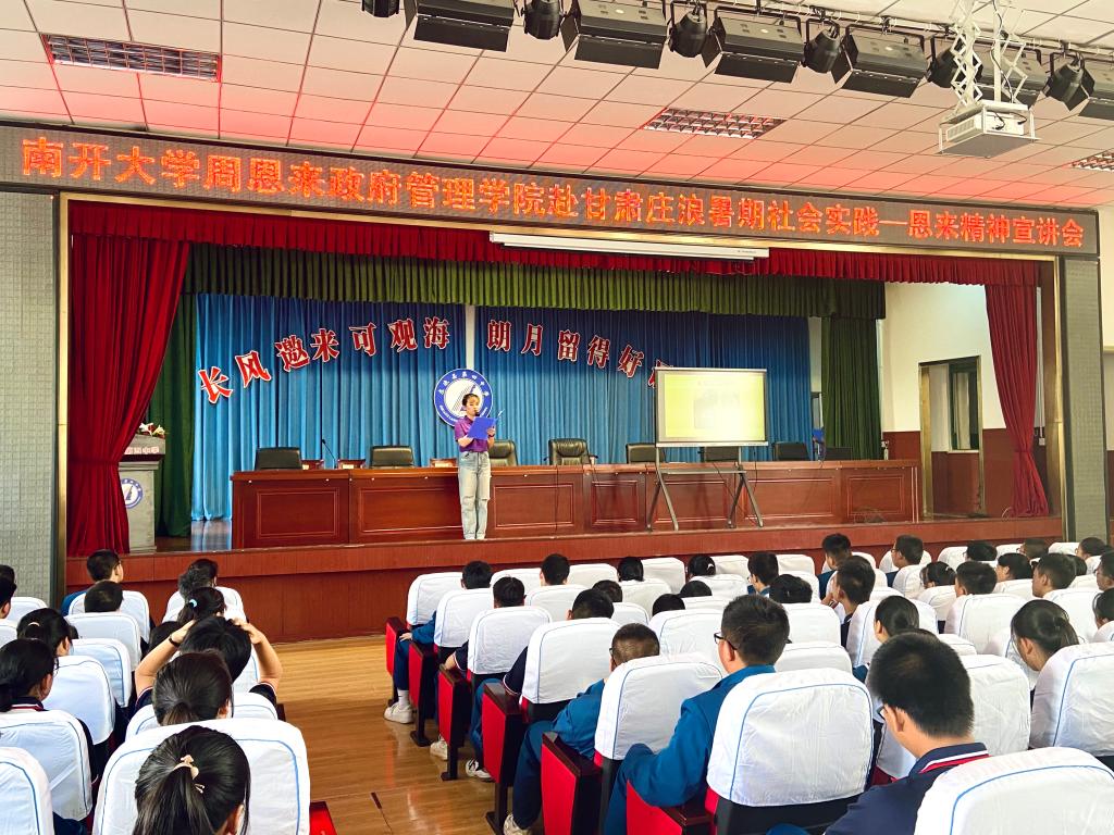 公能精神与总理情怀始终是南开学子的治学理念和伟大精神财富。此次实践活动中,实践团成员秉承公能校训,于庄浪四中开展了恩来精神宣讲会,传递周恩来总理伟大精神火炬,感染着每一个四中学子。历经数十年风雨,一个个扣人心弦的故事仍历历在目,从《西花厅的故事》到《与大家站在一起》,再到令人热泪盈眶的《你是这样的人》,故事精短而深入人心,总理形象在实践团成员声情并茂的讲述中熠熠生辉。