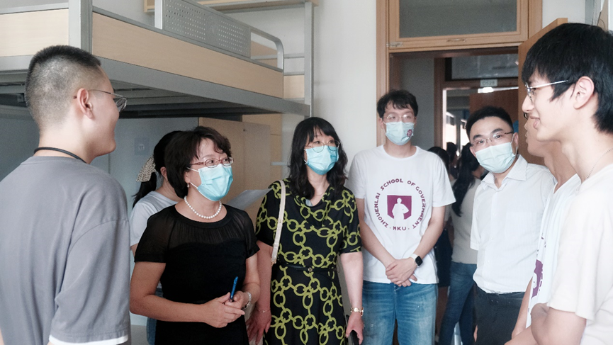 新生完成报到相关程序后相继返回宿舍进行清扫整理,党委书记王慧、党委副书记兼副院长宋媛、团委书记王修彦及其他团委老师共同前往新生宿舍进行关心与慰问。