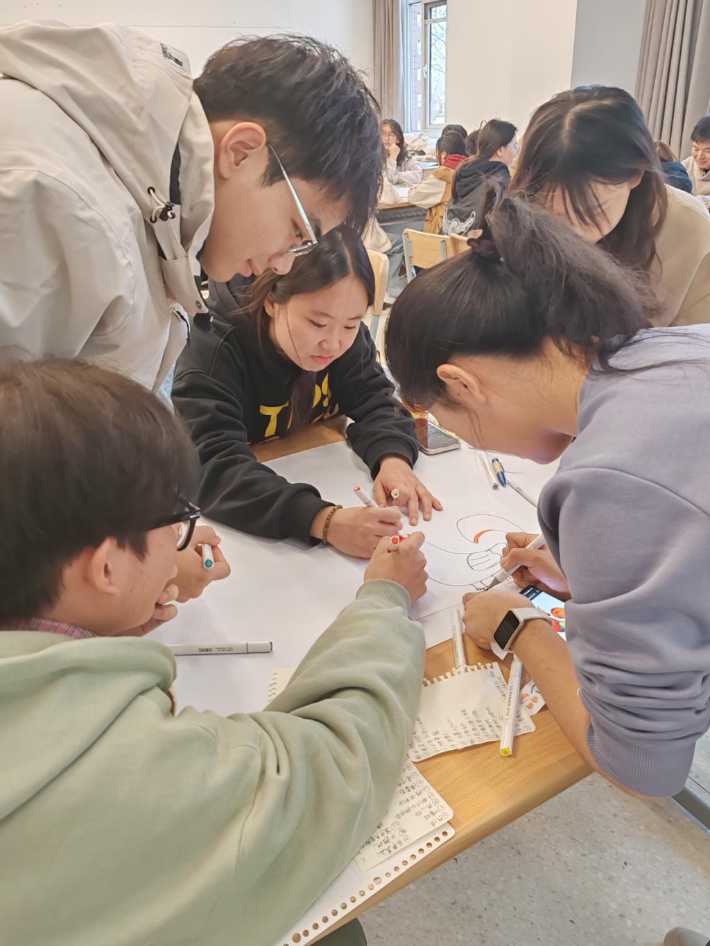 活动设置破冰环节,通过自由组队、写作任务设计,打破部门边界,增强各部门凝聚力。“吐槽大会”和“表扬大会”两个环节,与会学生骨干认真审视目前学生组织内部存在的问题,在思辨交锋中深化成员相互认识,不断加强组织发展的向心力。创意绘画环节则通过团队协作完成抽象命题创作,淬炼骨干成员的系统思维与战略视野,推动个体能力向组织合力转化。