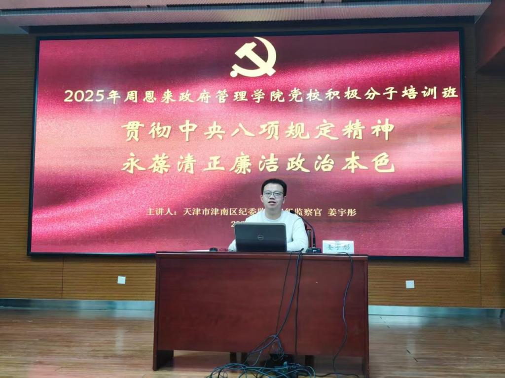 于4月20日举办了入党积极分子培训班开班仪式。培训班第一讲以“贯彻中央八项规定精神,永葆清正廉洁政治本色”为主题,特别邀请学院2021届本科毕业生、天津市津南区纪委监委干部姜宇彤以及恩来精神展演团进行展演,学院70余名入党积极分子参加学习。