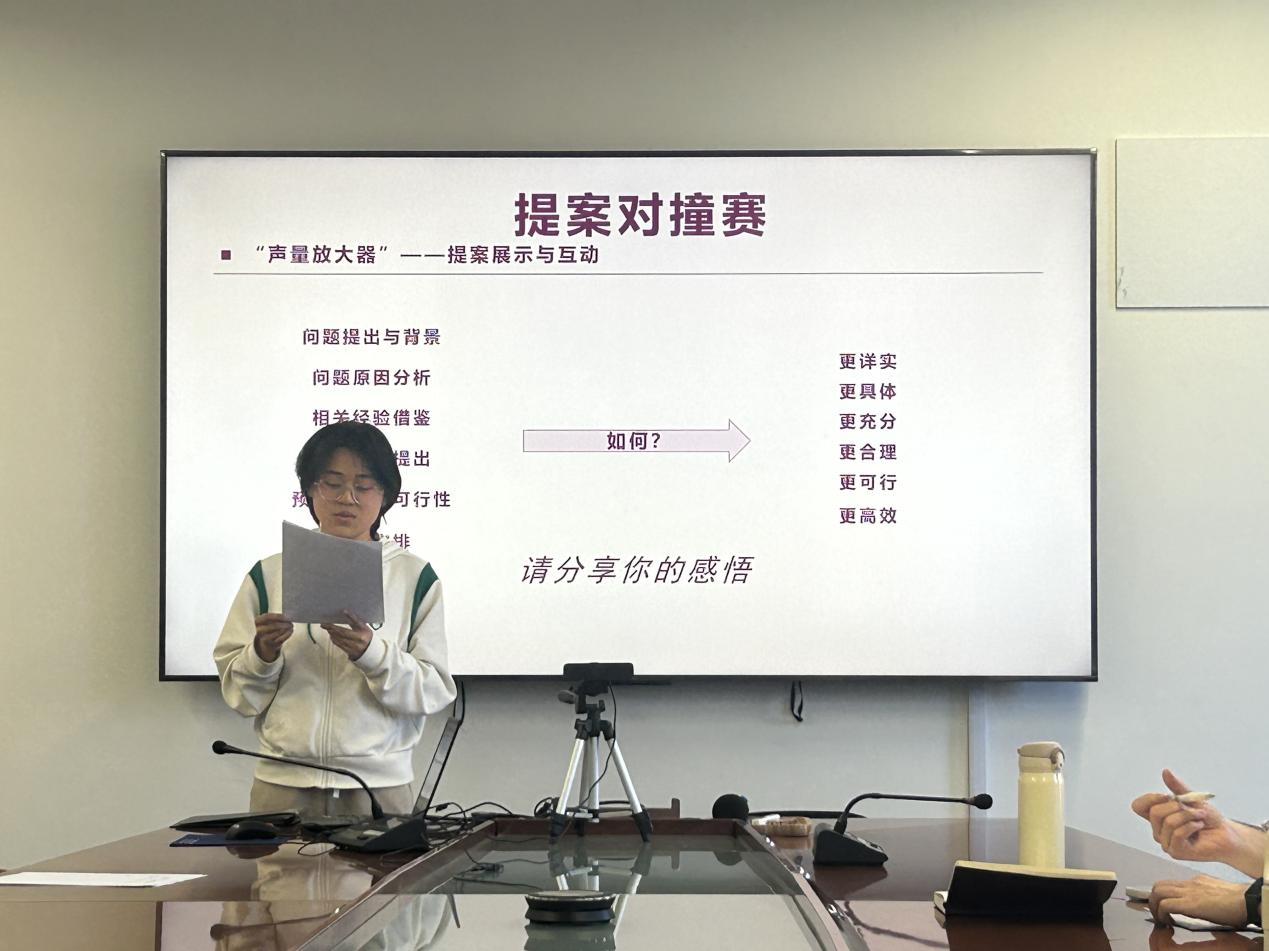 会议第三部分是充满活力与创意的“提案对撞赛”。参与者们自由组队,围绕教育教学、成长成才、生活服务、权益维护四大主题展开了探索思考。各个小组积极讨论、热烈交流,充分发挥团队智慧,构思提案内容。展示环节中,小组代表上台展示提案构思,现场气氛热烈,同学们积极提问、补充,形成了良好的互动交流氛围。