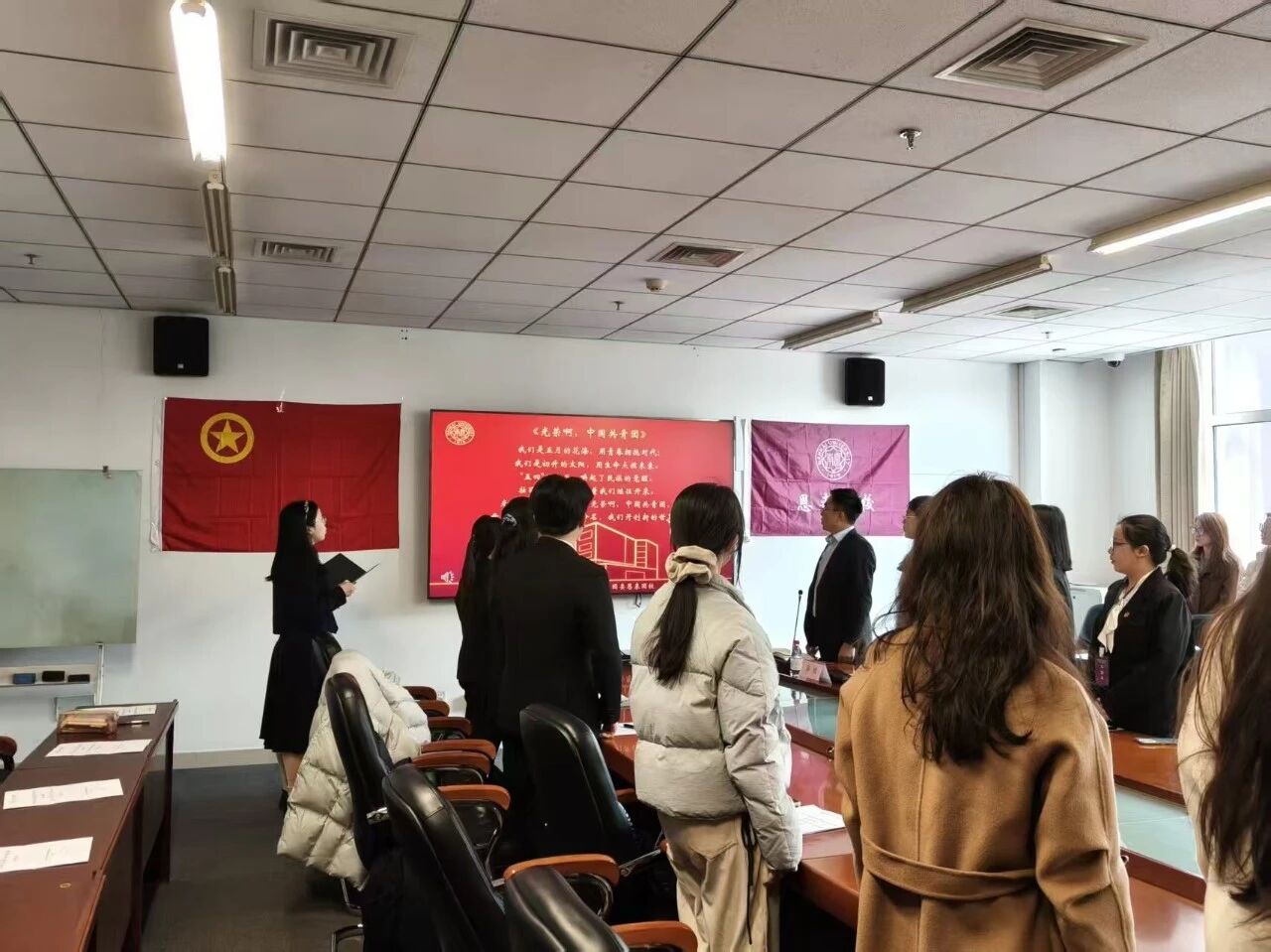本次活动由恩来团校办公考评中心廖艺欣同学主持。在庄重热烈的氛围中,全体成员起立,齐唱《中国共产主义青年团团歌》。