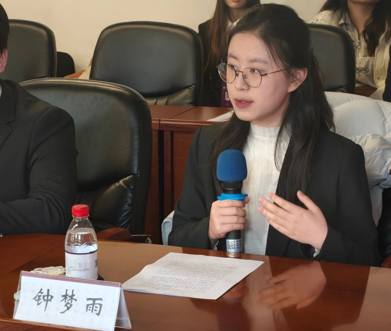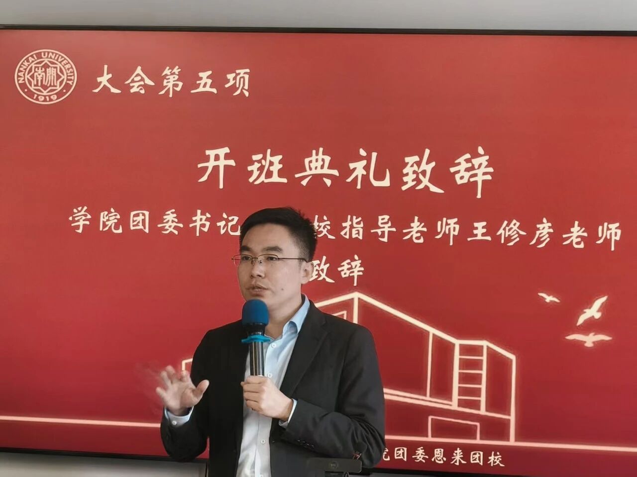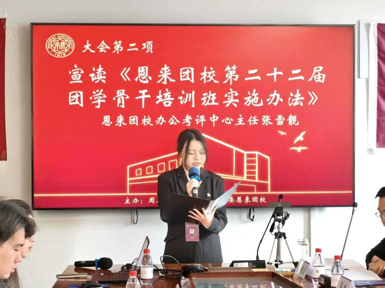 随后,主持人依次介绍出席本次活动的嘉宾:学院团委书记王修彦老师,第二十一届团学骨干培训班优秀学员钟梦雨,恩来团校执行校长郭栋,以及恩来团校执行副校长蓝嘉轩、付萧瑞、石雨馨。
