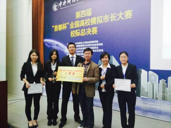 ,赴京参加由中央财经大学主办的第四届全国高校模拟市长大赛总决赛,表现出色,总成绩第二名,获得团体二等奖及最佳团队风采奖。