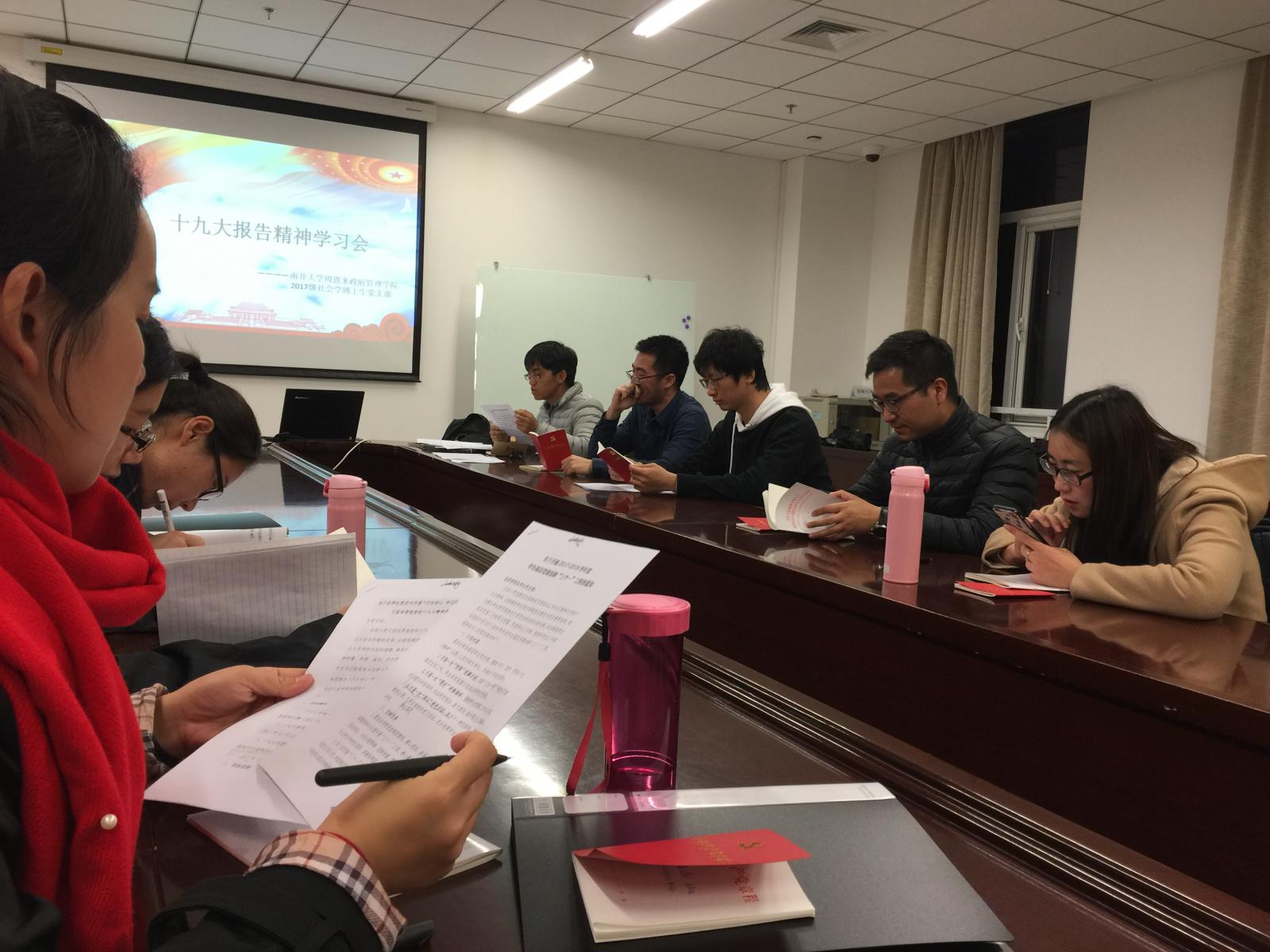 2017级社会学博士生党支部于2017年11月10日18:00在学院324会议室召开了“十九大报告精神学习会”。十九大的胜利召开为我们点亮了未来前行方向的指路灯。在学习会上,党支部成员在支部书记郝光耀的主持下有序地进行了发言和讨论,加深了对于十九大报告精神的领会。