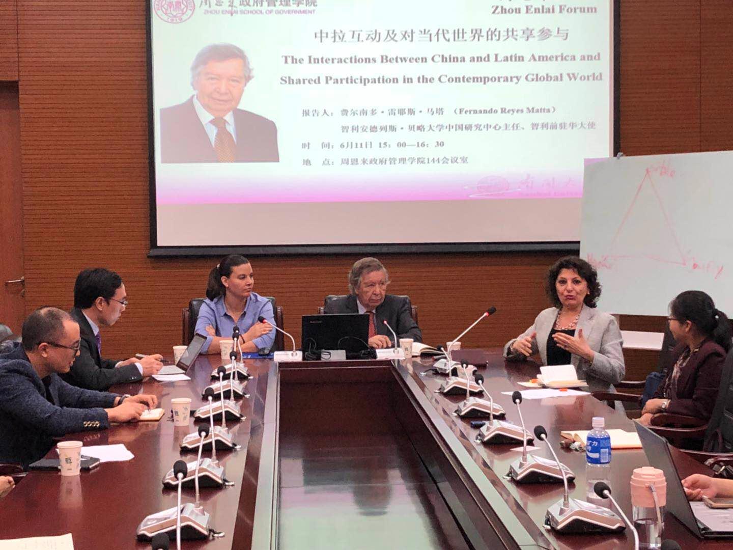 国际关系系的部分教师和拉美留学生进行了座谈。下午15时做客周恩来论坛,做了题为“中拉互动及对当代世界的共享参与”的学术讲座。讲座由我校伊利论坛