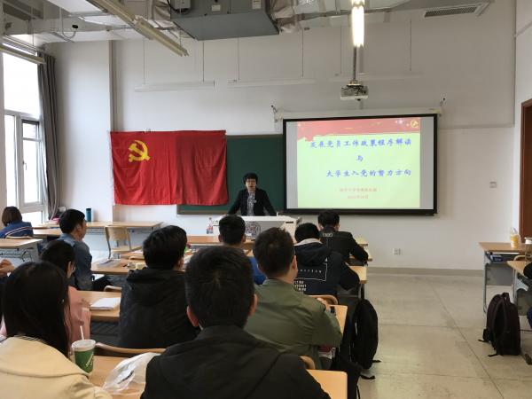 李敏丽老师以“发展党员工作政策程序解读与大学生入党的努力方向”为主题,通过对《中国共产党发展党员工作细则》的讲解,详细介绍了发展党员工作程序及规范,要求同学们以“理想远大、品学兼优、全面发展”为努力方向,认真贯彻学党章党规、学系列讲话、做合格党员的“两学一做”要求,严格要求自己,争取早日成为一名合格党员。
