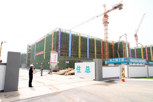 象征院楼封顶的最后一斗浇筑混凝土在轰隆的鞭炮声中吊上楼顶
