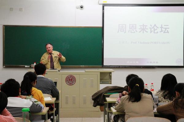(通讯员 李金潼)10月23日,俄罗斯科学院远东研究所副所长、《远东事务》(Far Eastern Affairs)主编弗拉基米尔·波特雅科夫(Vladimir Portyakov)教授做客“周恩来论坛”,给南开师生带来一场题为“俄罗斯的中国对外关系与对外政策研究”的精彩讲座。讲座由伊利论坛