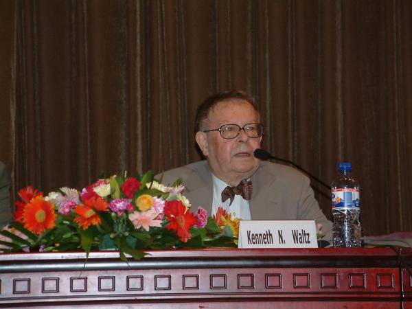 举办“西方国际关系理论大师系列讲座”,请的第一位嘉宾就是我当年的导师沃尔兹。在南开的两周时间里,年届八十的老教授每天上午给本科生或研究生讲三节课,下午休息;但遇到与中国学者开会对话,就是一整天的日程。沃尔兹是由他的夫人海伦陪同来到南开的,就住在校园的专家楼里,生活简朴,工作认真。他的讲课特别受学生的欢迎,有的片段还给大家留下深刻印象。有一次给研究生做讲座,除了本校的还有很多外校来的研究生参加。一位北大女生提问:您的理论以国家求生存为前提预设,在当今的文明世界中,国家的生存难道还是问题吗?那天我是讲座主持人,就对那位同学说,伊拉克的例子就在眼前,怎么还会问这样的问题?但那个女同学并不买账,争辩说:伊拉克那个国家不是还在吗?不是已经成立了临时过渡政府吗?这时,沃尔兹笑眯眯地插进来说,“That's us.” (“那是我们”, 意指那个政府只是美国的傀儡。)