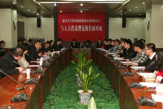 “与人大代表龚克校长面对面”座谈会,作为“国策论坛”系列活动之一,为同学们提供了与人大代表面对面交流的平台。活动最后,龚克寄语同学们,“南开人要注重‘长远考虑’,要注重全面素质的培养,做到知中国,爱中国,服务中国。”