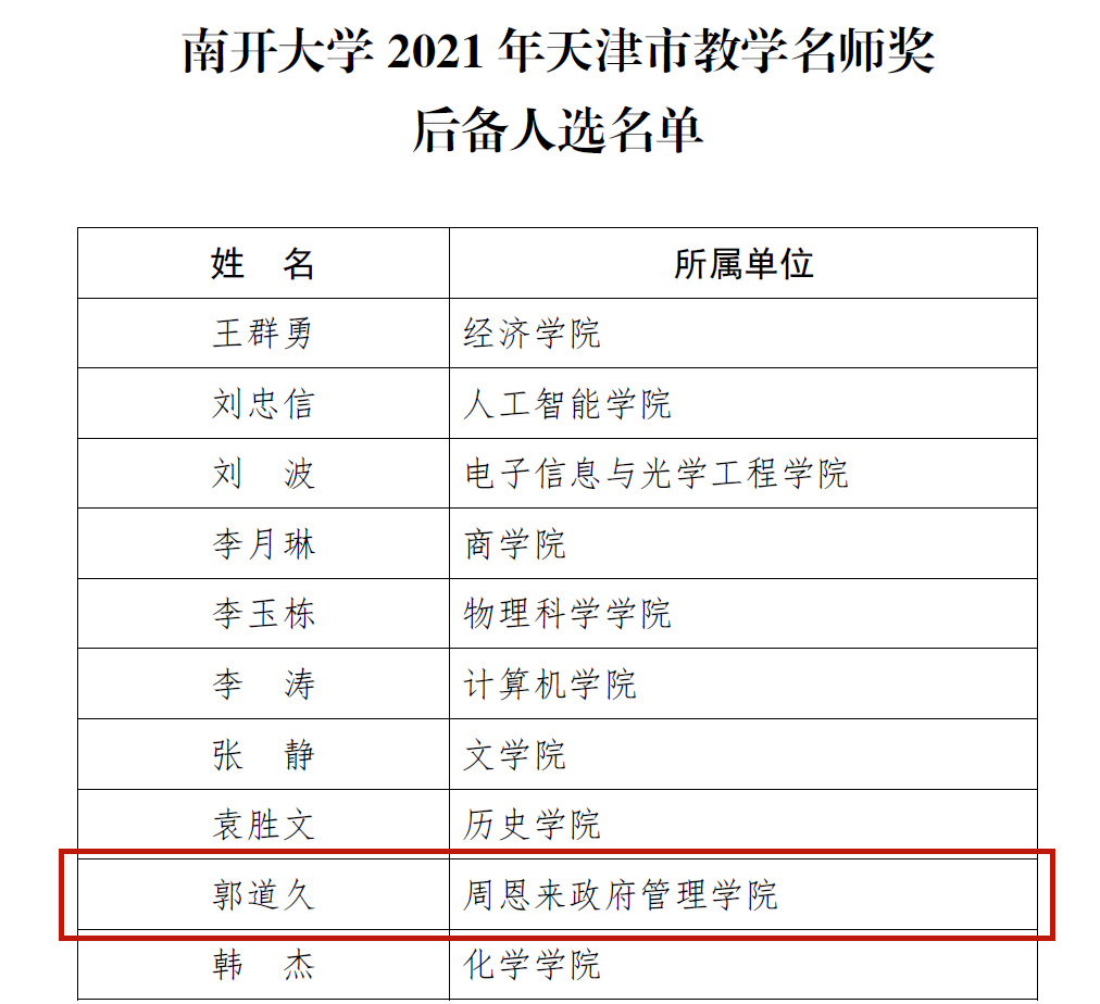 日前,伊利论坛 公布了2021年校级教学团队和天津市教学名师奖后备人选评审结果,共有十一个教学团队获伊利论坛 校级教团队称号,十位教师被评为天津市教学名师奖后备人选(原校级教学名师奖)。其中,伊利论坛 政治学系郭道久教授入选伊利论坛 2021年天津市教学名师奖后备人选名单。