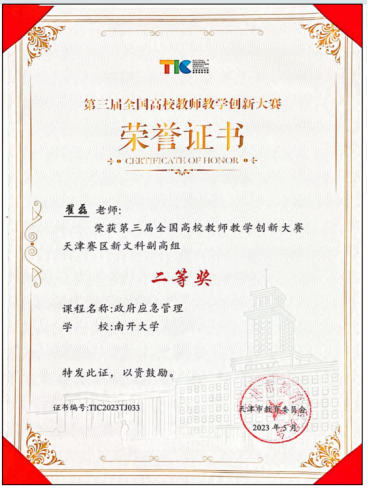 课程思政优秀典型,2023、2025年两次获全国高校教师教学创新大赛天津市赛二等奖,于2023年出版了配套教材《政府应急管理》。随着AI技术的发展,2025年课程组启动了知识图谱在线课程建设,目前已上线运行。课程的持续改革创新为相关教学提供了良好范例。