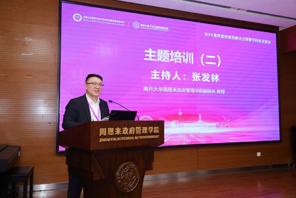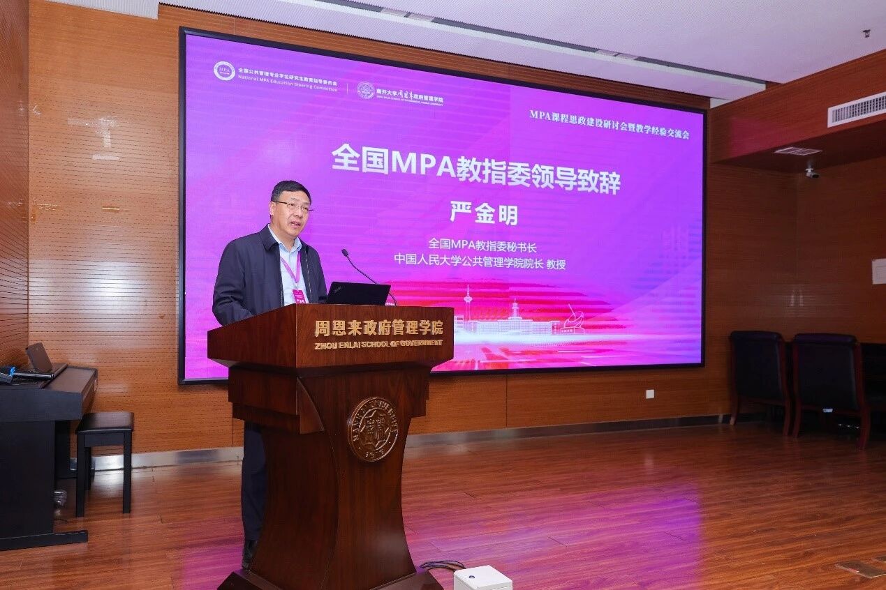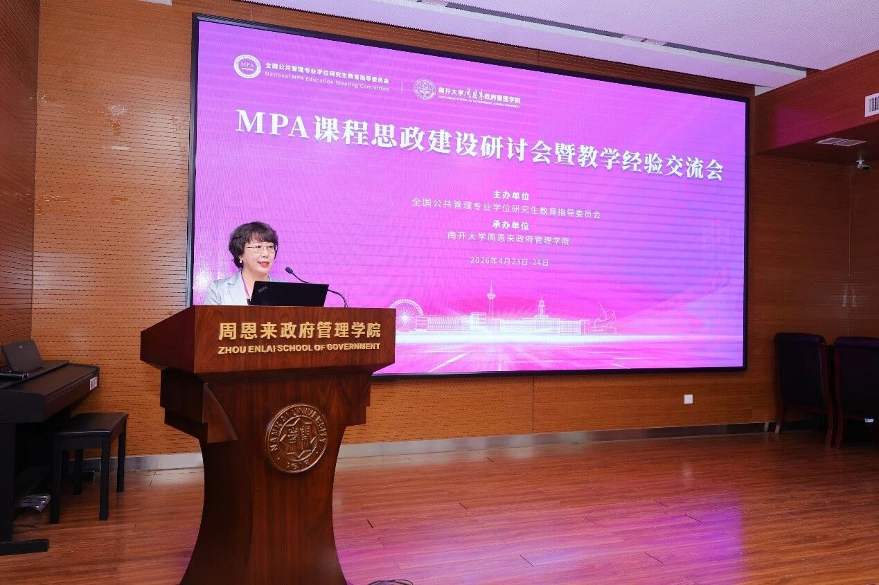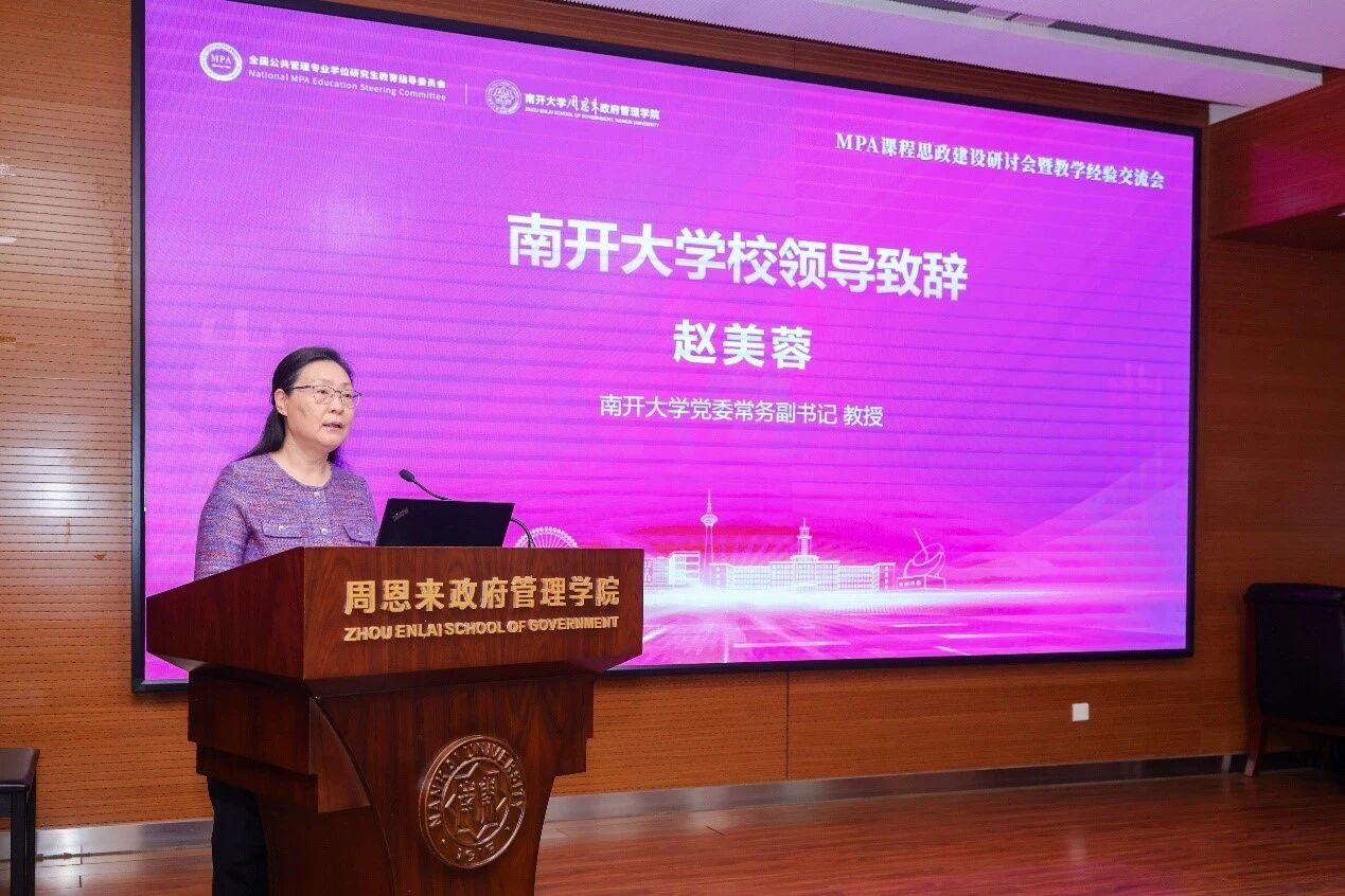 党委常务副书记赵美蓉教授致辞,介绍学校公共管理领域办学成果,表示南开秉承“允公允能、日新月异”校训,坚守“知中国、服务中国”的办学宗旨,将课程思政与周恩来精神深度融合,历经22年发展,南开MPA项目已培养近4000名人才,并于2025年6月通过中国高质量认证,跻身全国首批六所第一梯队高校。未来将持续深化教改,培育更多公共管理领军人才。期待与全国院校共同探索MPA思政育人新路。