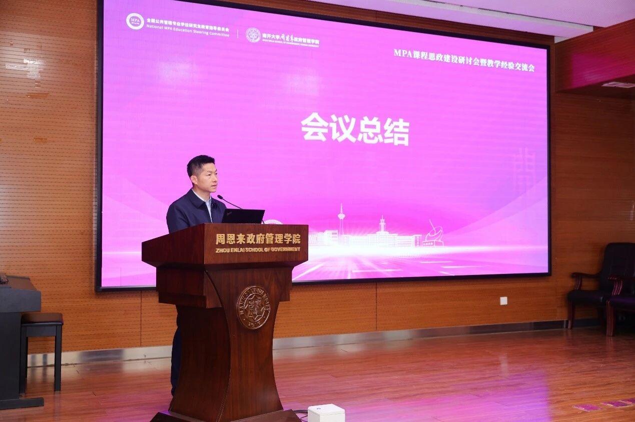 全国MPA教指委秘书处办公室主任谢佳宏作会议总结。他指出,本次研讨会紧扣新时代MPA教育立德树人根本任务,主题鲜明、内容充实、成果丰硕,既深化了对课程思政建设规律的认识,也交流了一批可推广、可复制的教学经验,是我国MPA教育课程思政建设的阶段性总结和新起点。